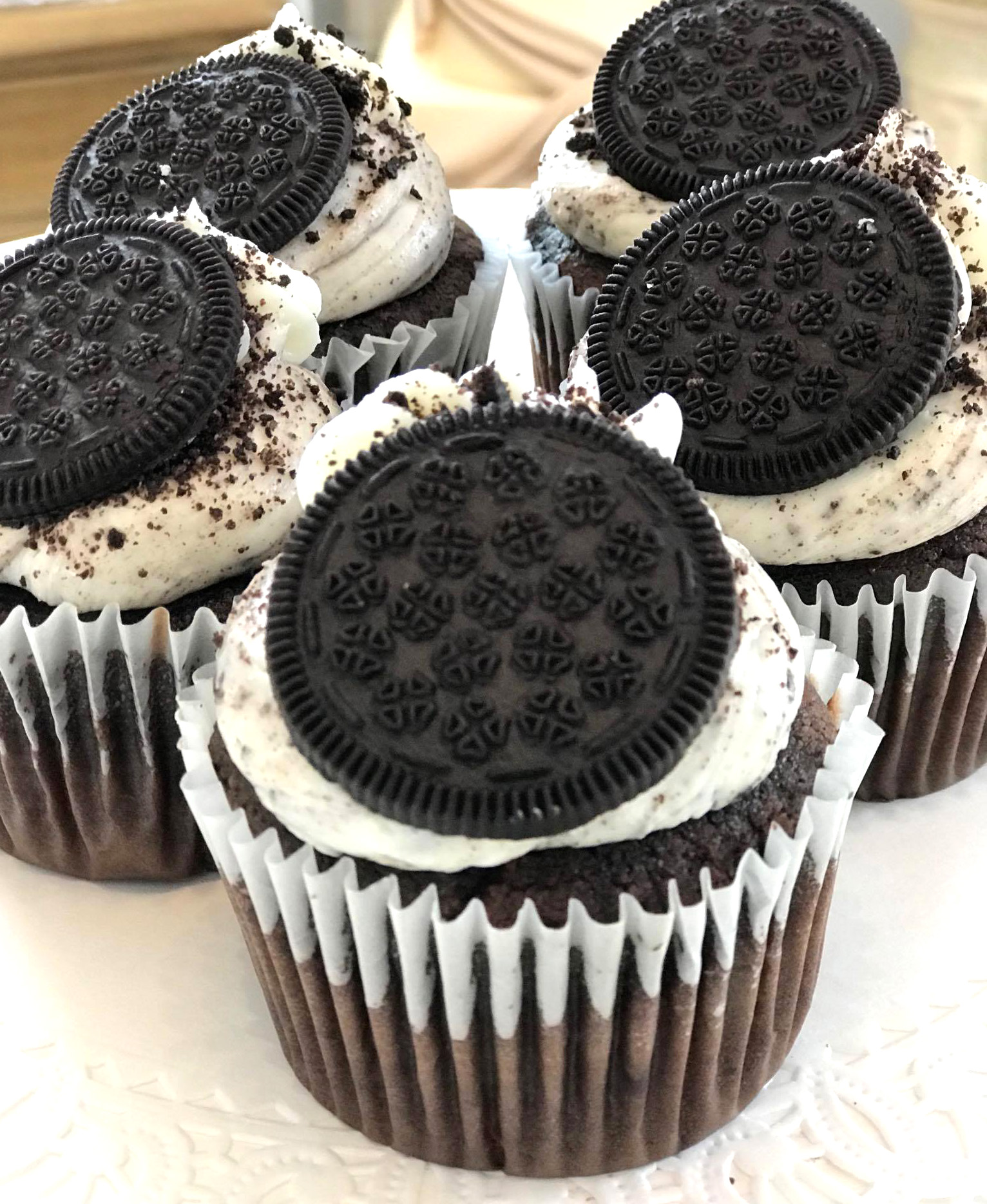 Cookies & Creme; Chocolate cake with cookies and cream icing, kissed with white and chocolate icing, topped with a chocolate cookie