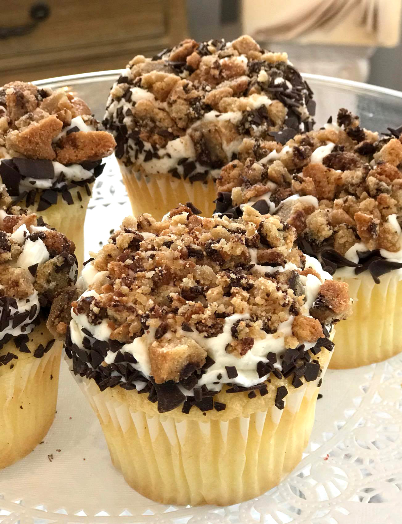 Chocolate Chip Cookie Crumble; Butter Golden Cake with white icing, smashed in Tanya’s from-scratch chocolate chip cookies